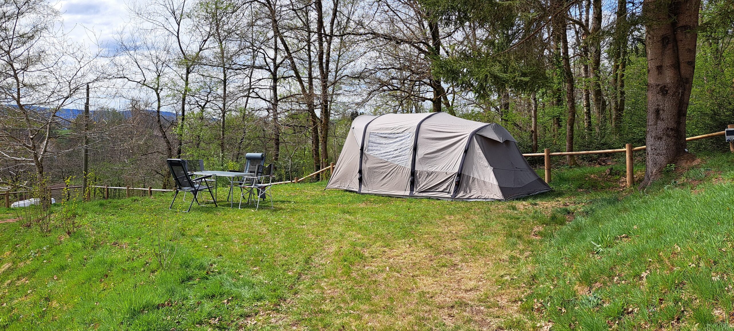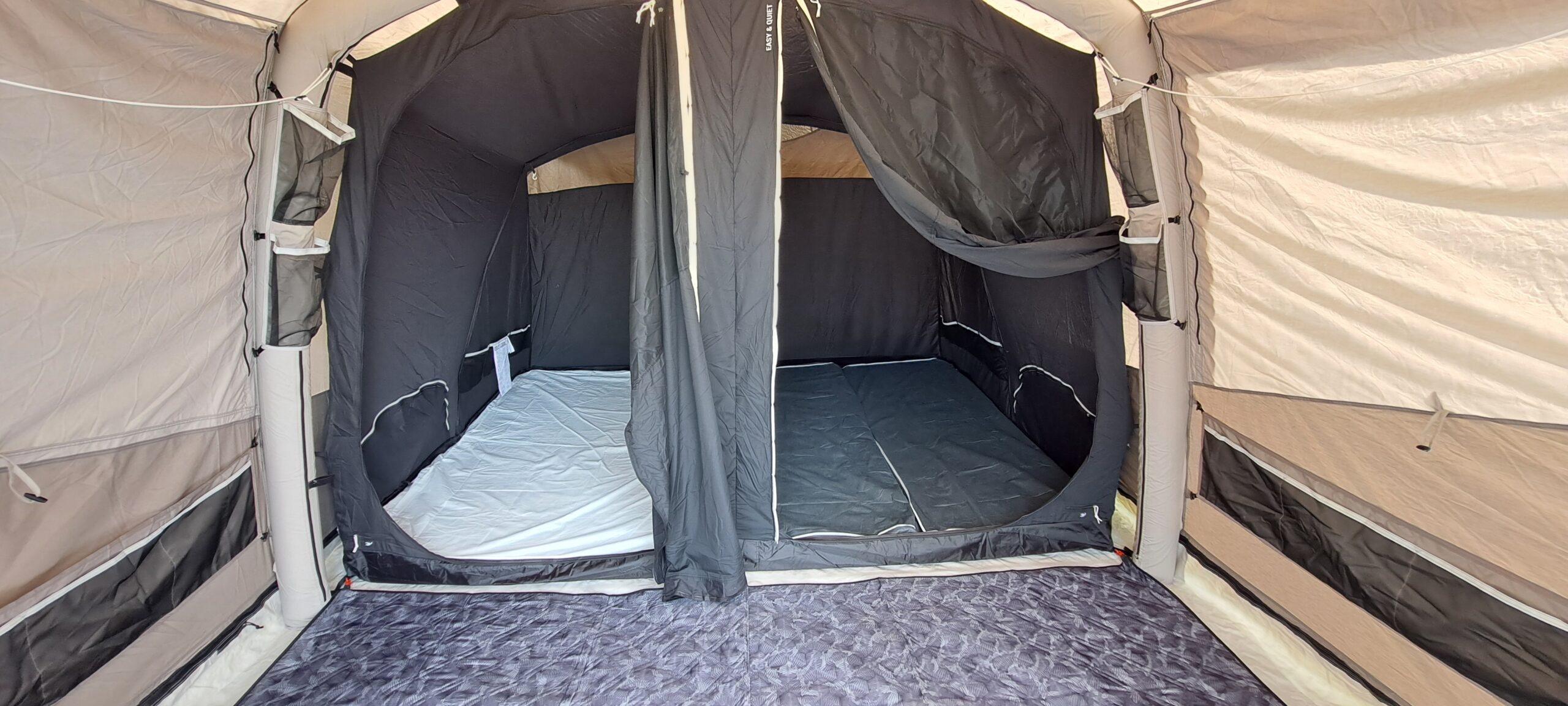 - Tente comprenant deux chambres avec matelas autogonflants double pour l’une, 2 matelas autogonflants 1 personne accolés et un espace séjour.