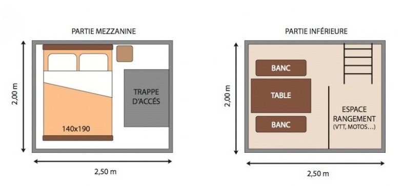 Cette structure originale en bois et toile vous invite à prendre de la hauteur : ici, on dort à 1,80 m du sol ! Une expérience insolite pour s’isoler de l’humidité et profiter d’une nuit perchée. Sous l’espace nuit, vous disposez d’un abri sécurisé pour vos vélos et votre matériel, ainsi que d’un coin pique-nique pour vos repas en pleine nature.